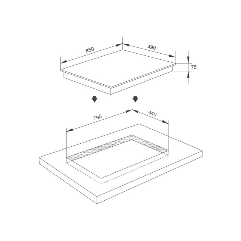- Kích thước lỗ đá: W790 x D440mm